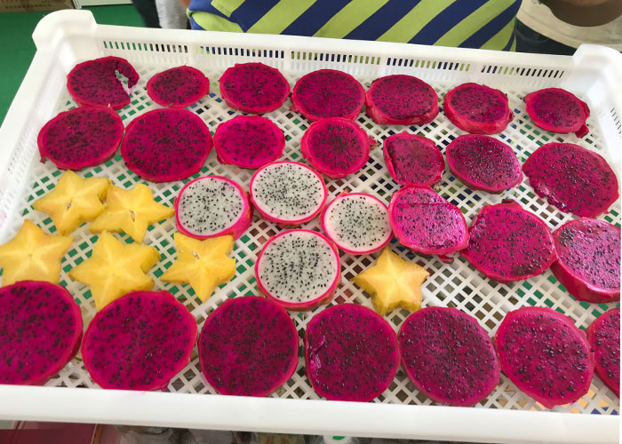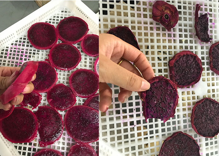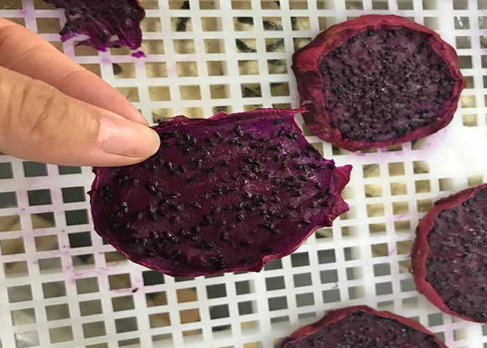 首先,選取新鮮飽滿并且是7-8分熟的火龍果采摘(紅肉或者白肉的火龍果都可以),紅肉火龍果烘干出來的果干口感更好。采摘后的火龍果清洗干凈之后去皮,然后切成1-1.5cm的厚度,厚度不宜太薄以免影響火龍果肉質的口感,切得時候厚度還要均勻一致否則會影響烘干的效果。切片后的火龍果擺放在烘干盤內,擺放時不可重復疊加,片與片之間要留有縫隙,以利于風的均勻穿透,這樣烘干的效果較好。