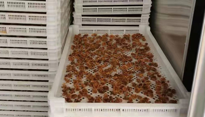 清洗后的刺梨切成兩半,把里面的種子挖出后將處理好的刺梨均勻的擺放在烘干托盤內,放進烘干房內進行烘干。